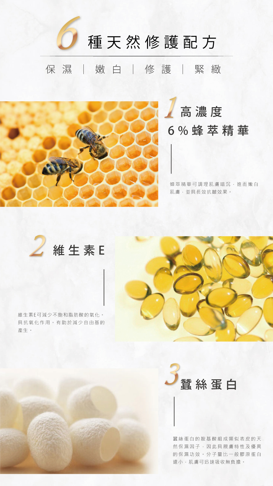 ◉成分:高濃度6%蜂萃精華、維生素E、蠶絲蛋白、神經醯胺、輔酶Q10、酪梨油。